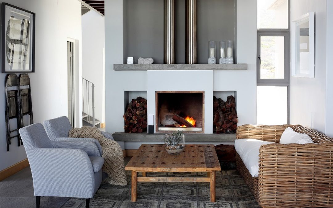 Entertainment area indoors with fireplace (pipes heating upstairs main bedroom area) and braai.